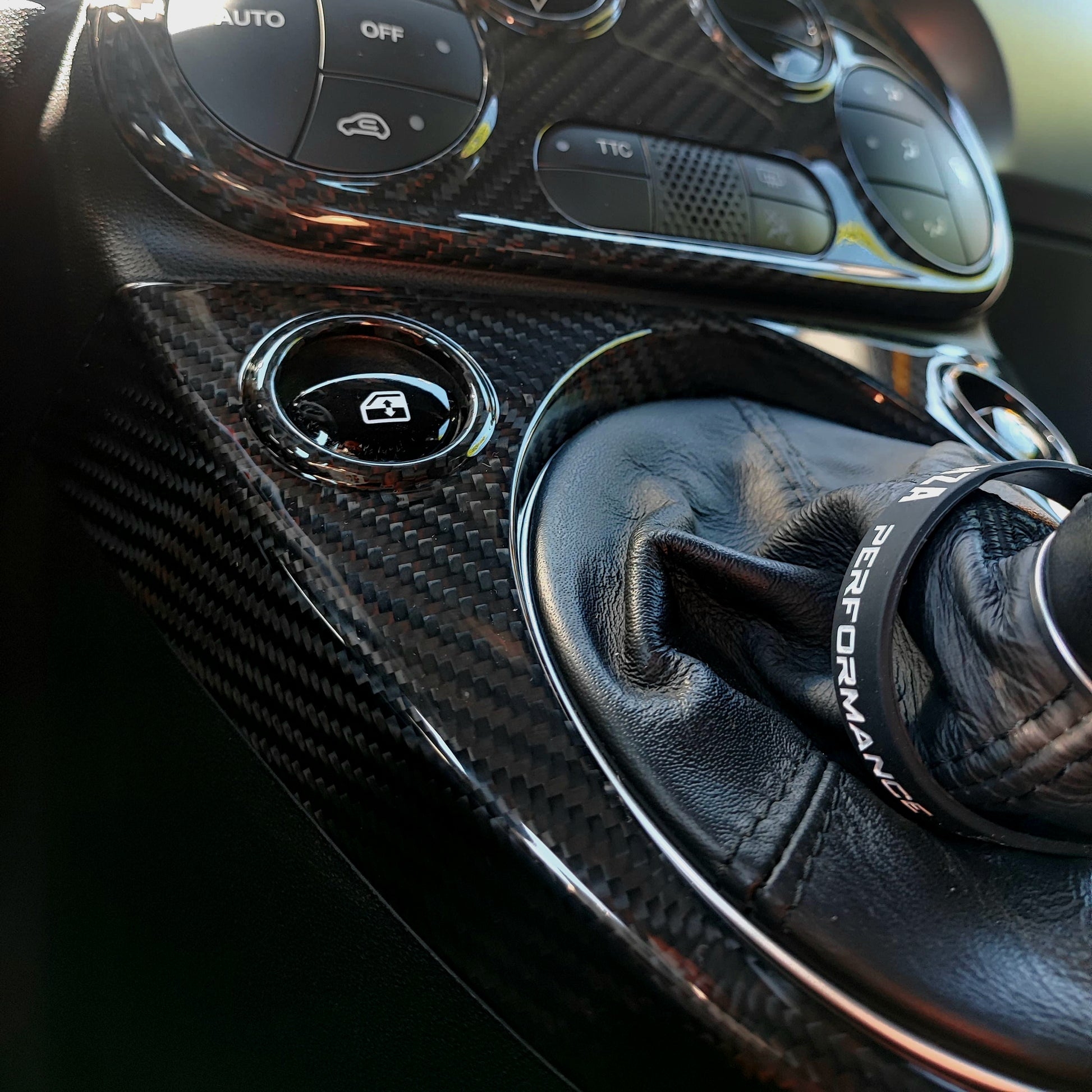 Cover di alta qualità realizzata in vero carbonio per il cambio dell'auto.