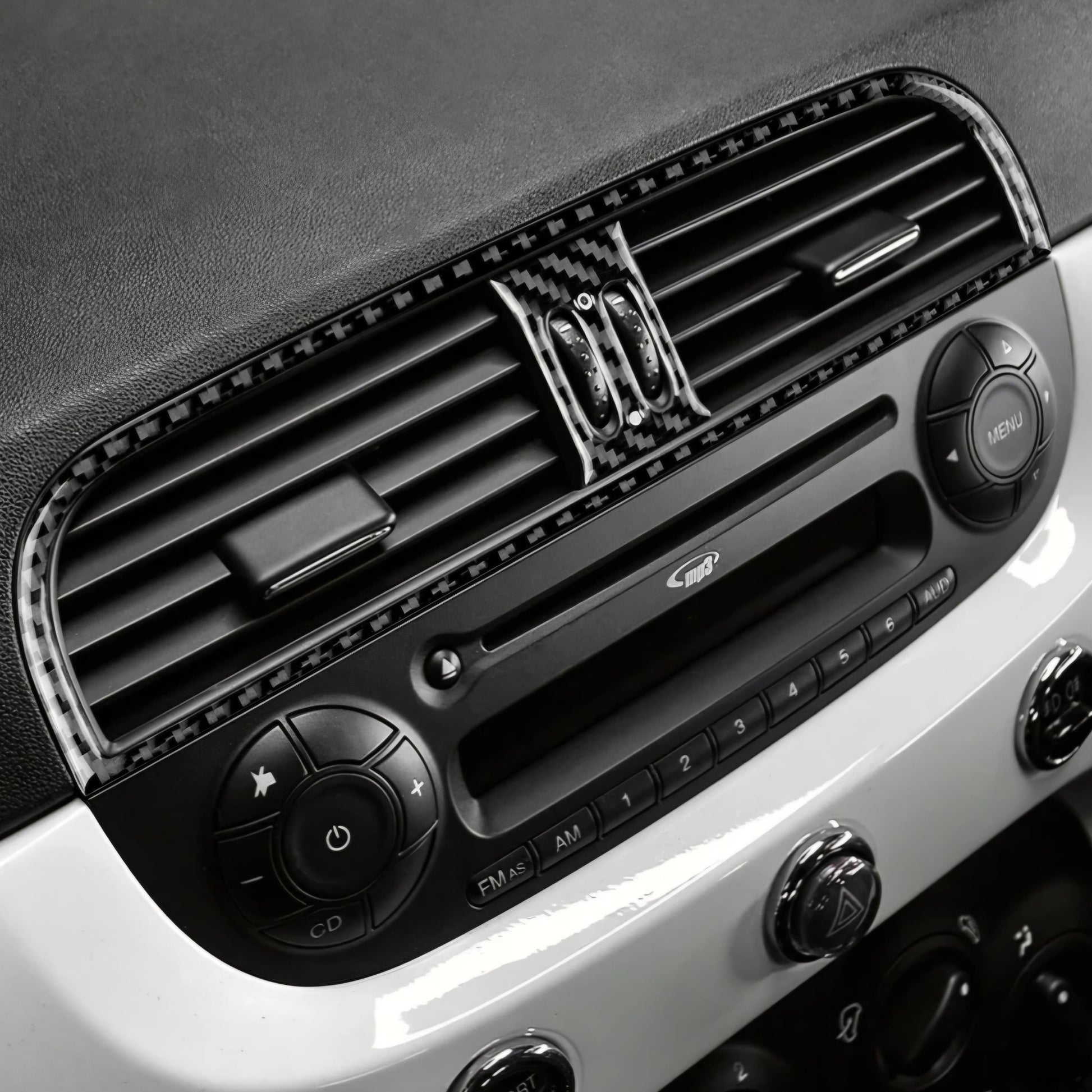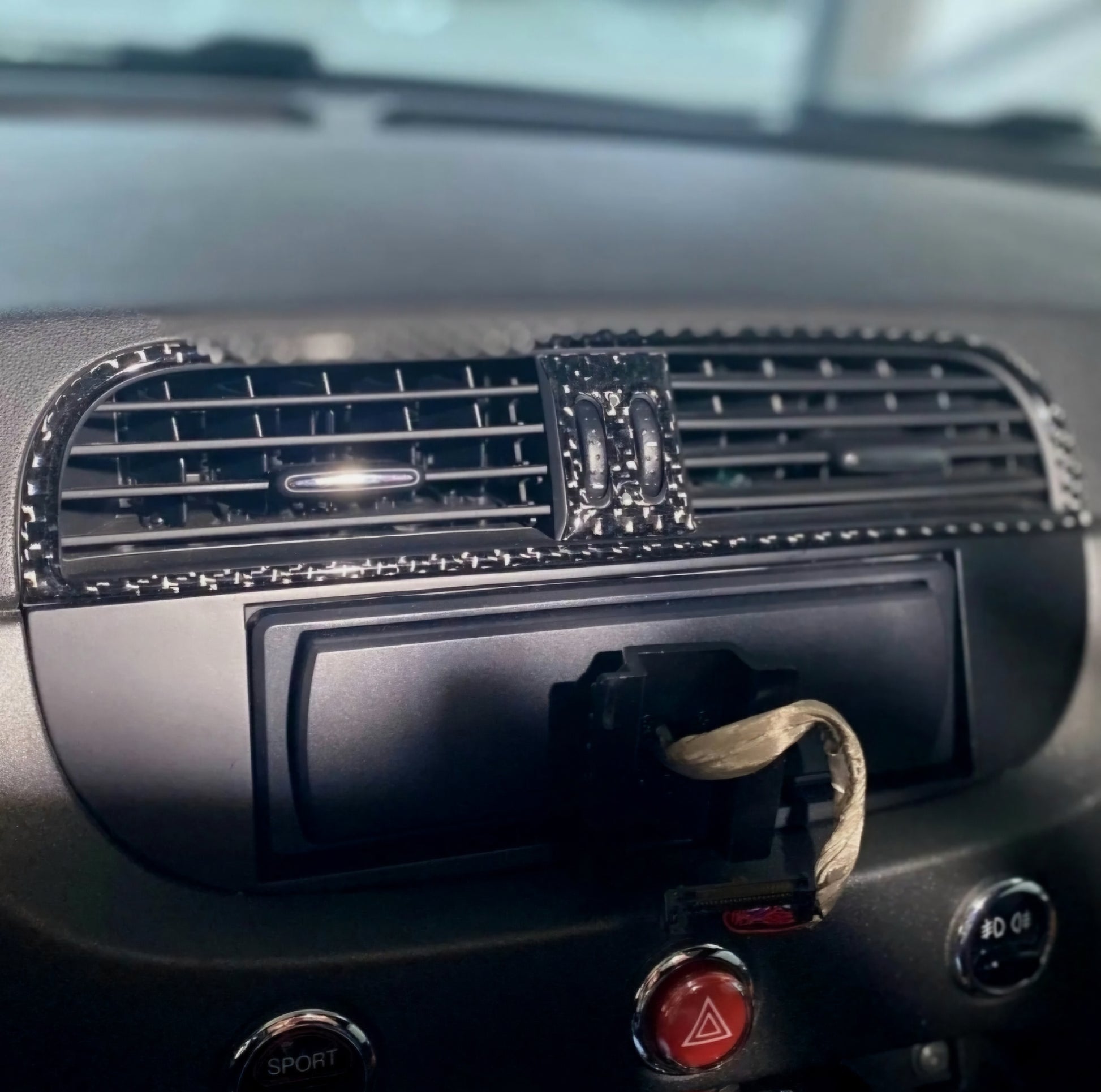 Cover resinata morbida di alta qualità realizzata in vero carbonio per il bocchettone dell'aria centrale del cruscotto.